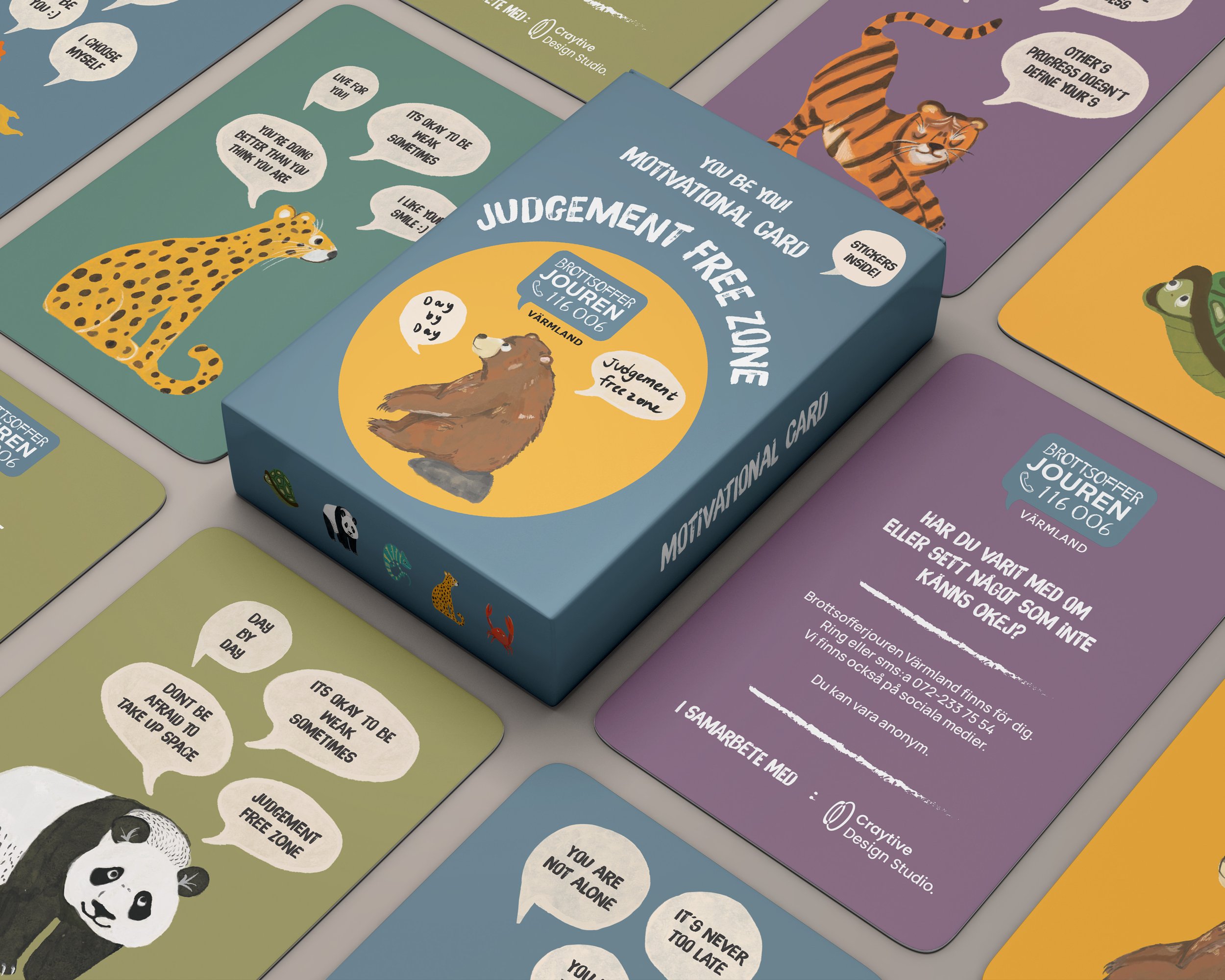 Using Brottsofferjouren’s color palette, with rounded shapes and minimal details, so the messages remain the focus. On the back of each card, contact information is included.